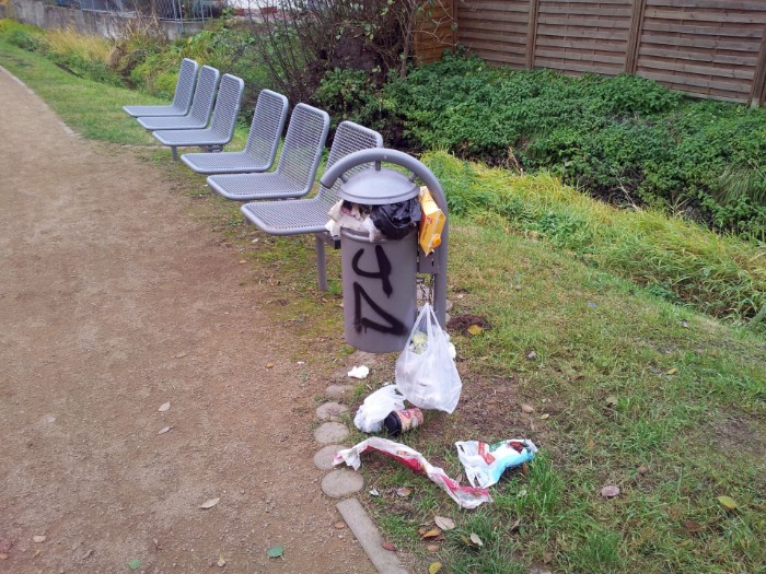 Was ist hier zu klein, dass kann doch nur der Mülleimer sein ! In lauen Sommernächten feiern hier Jugendlliche. "Große und kleine" Geschäfte werden auf unserem Gelände hinter den Gebäuden erledigt. Da hat man(n) beim Mähen des Grases so richtig Freude. |